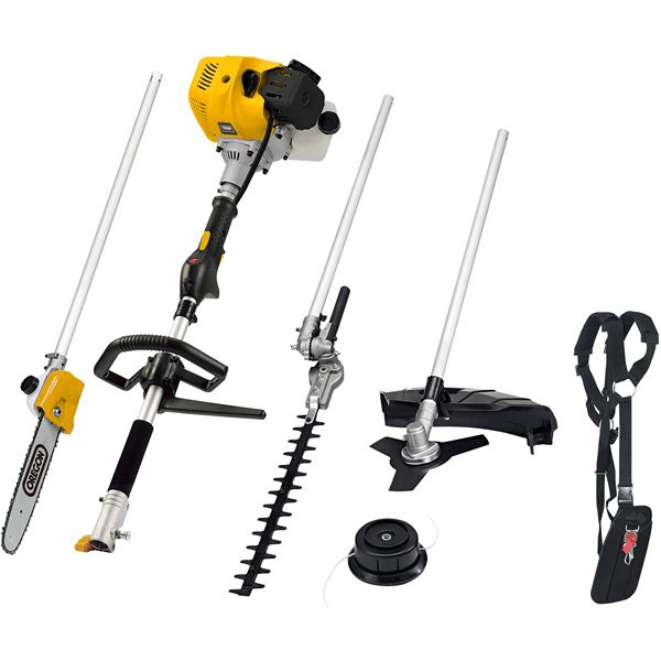 Multifunkčný stroj TEXAS BCU43M 4-v-1 s čepeľou, vyžínacou hlavou, motorovou pílou a nožnicami na živý plot. Deliteľný hriadeľ uľahčuje prepínanie medzi príslušenstvom. Celková dĺžka stroja s nožnicami na živý plot / reťazovou pílou je 2,30 m. Vrátane popruhu na prenášanie. Aby bolo možné dosiahnuť vysoké miesta, je možné dokúpiť predlžovaciu tyč (76 cm). Celková dĺžka stroja s predlžovacím nástavcom a plotostrihom / reťazovou pílou je 3,06 m. Možnosť dokúpenia ďalšieho príslušenstva ako sú orezávače trávnikov, zmetáky a fukáre lístia.